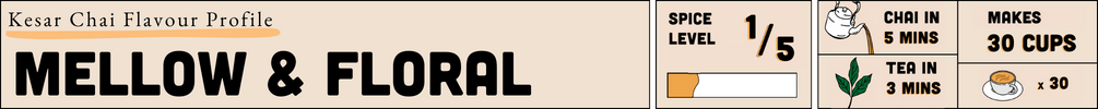 Our Kesar Chai blend is a strong black tea infused with saffron and rose. It is inspired by the Chaiwallas of Kolkata and has an earthy yet sweet floral flavour.